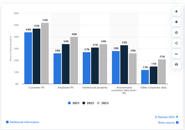 Per capire la necessità di proteggere questo tipo di asset è necessario osservare il panorama generale. Per esempio, secondo una statistica, la quantità di dati aziendali compromessi aumenta di anno in anno, con l’eccezione dei dati dei clienti anonimizzati, per ovvie ragioni di appetibilità sui mercati sommersi. Bisogna sottolineare come, accanto ai dati personali di clienti e impiegati, sia sotto attacco anche la proprietà intellettuale.